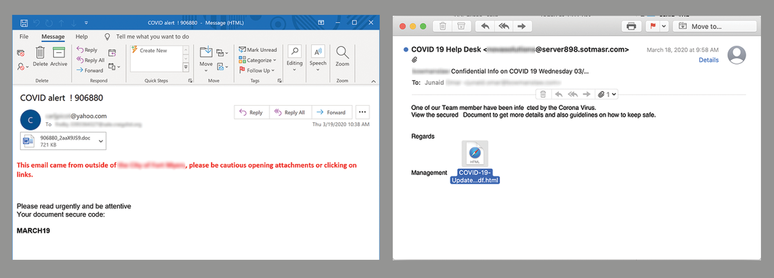- Email with subject line "COVID alert" asking the user to "Please read urgently and be attentive." The email provides a "document secure code" and a Word document is attached. When opened, this Word document could deliver malware.